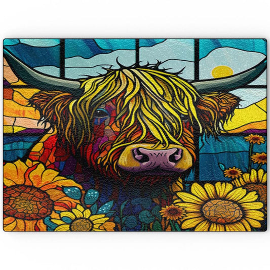 Highland Cow With Sunflowers (Stained Window Effect) - Glass Chopping Board